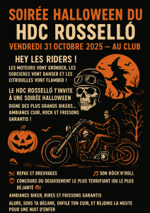 Le HDC ROSSELLÓ t’invite à une soirée Halloween digne des plus grands bikers… ambiance cuir, rock et frissons garantis ! 🏍️💀